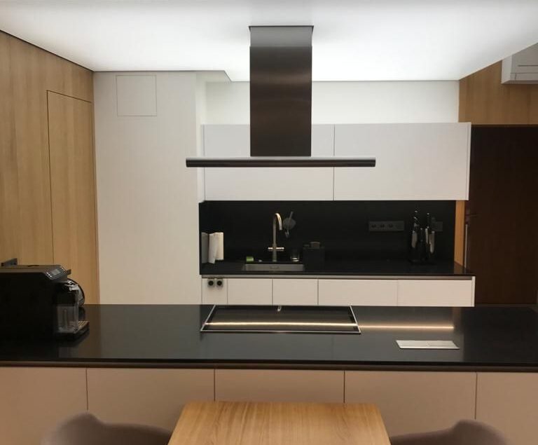 The main feature of this ceiling is its frameless form. The design consists of a concealed frame covered with a translucent film. It is illuminated from the inside along the entire perimeter, creating an effect of even and soft light. This panel has a high light output, making it ideal for illuminating this kitchen.